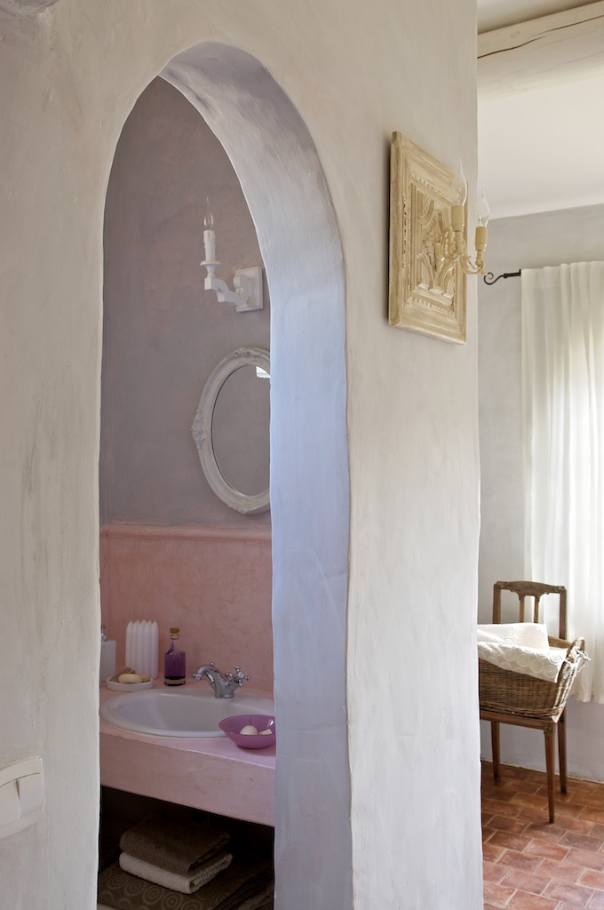 A spa bath, walk-in shower and a plan with basin on tadelackt plan to the old and a toilet for the adult room.